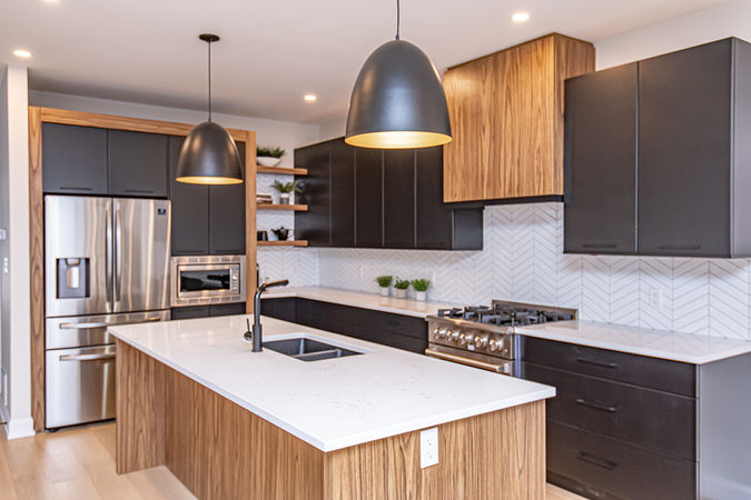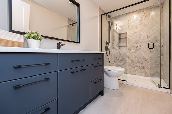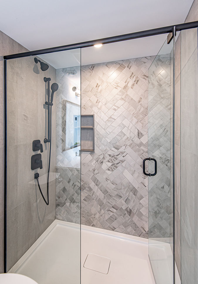 This was a new construction build so we had a lot of fun getting to be creative with our tile and finishes selections. One side our client was going to live in and the other was a rental income property for her.